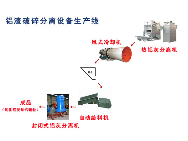 單獨的熱鋁灰轉化冷鋁灰分離生產線:熱鋁灰→→風式冷卻機→→料倉→→自動給料機→→封閉式鋁灰分離機→→成品(氧化鋁灰與鋁顆粒)